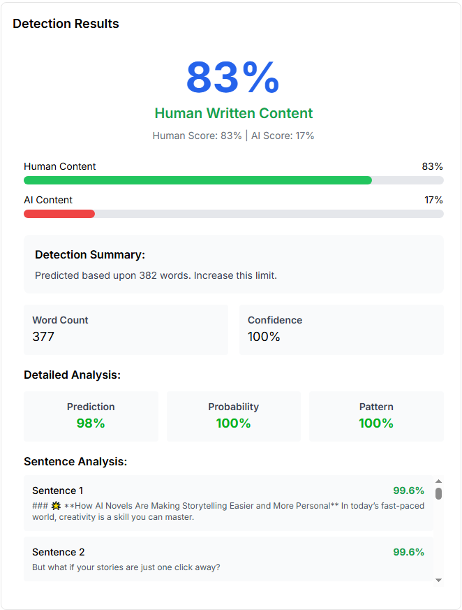 The Summary: This gives you the basics, like word count, and a Confidence score. Seeing "100% Confidence" is like the tool saying, "I've run the numbers, and I'm really, really sure about this."