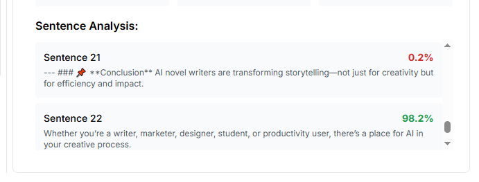 It creates a "heat map" of your text, showing you exactly which sentences shine with human creativity and which ones fall flat. You might see "Sentence 1" glowing with a 99.6% human score, but then "Sentence 21" gets a dismal 0.2%, basically screaming "A robot wrote me!"